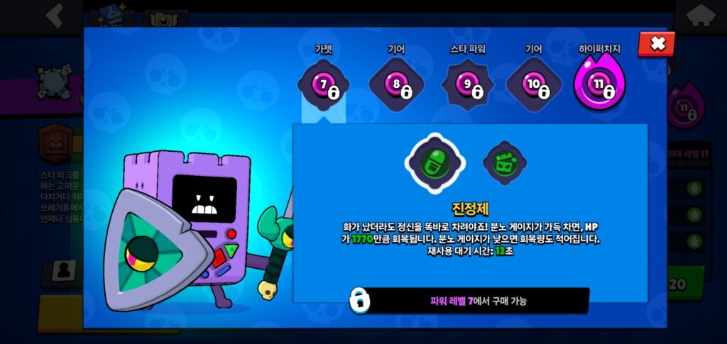 체력을 일부 소모하고 분노 게이지를 즉시 크게 올립니다. 체력을 희생하지만 약한 초반 타이밍을 넘길 수 있는 공격형 가젯입니다.